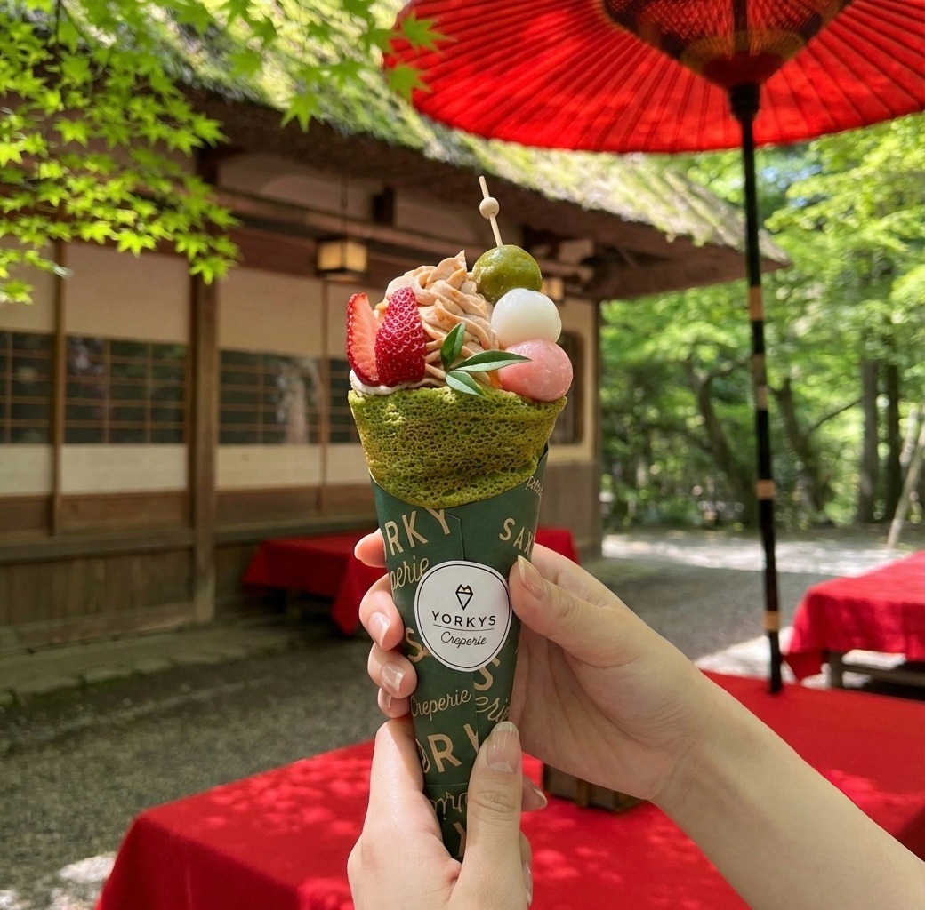 春爛漫!うめきた公園での散策やお花見のお供に、YORKYSの限定クレープはいかがですか?三色団子といちごを飾った「春うらら抹茶クレープ」は、抹茶生地にわらび餅やきな粉クリームが詰まった贅沢なパフェ仕立てです。ルクアから歩いてすぐの店舗で手に入れて、開放感あふれる公園で春の味覚をお楽しみください!