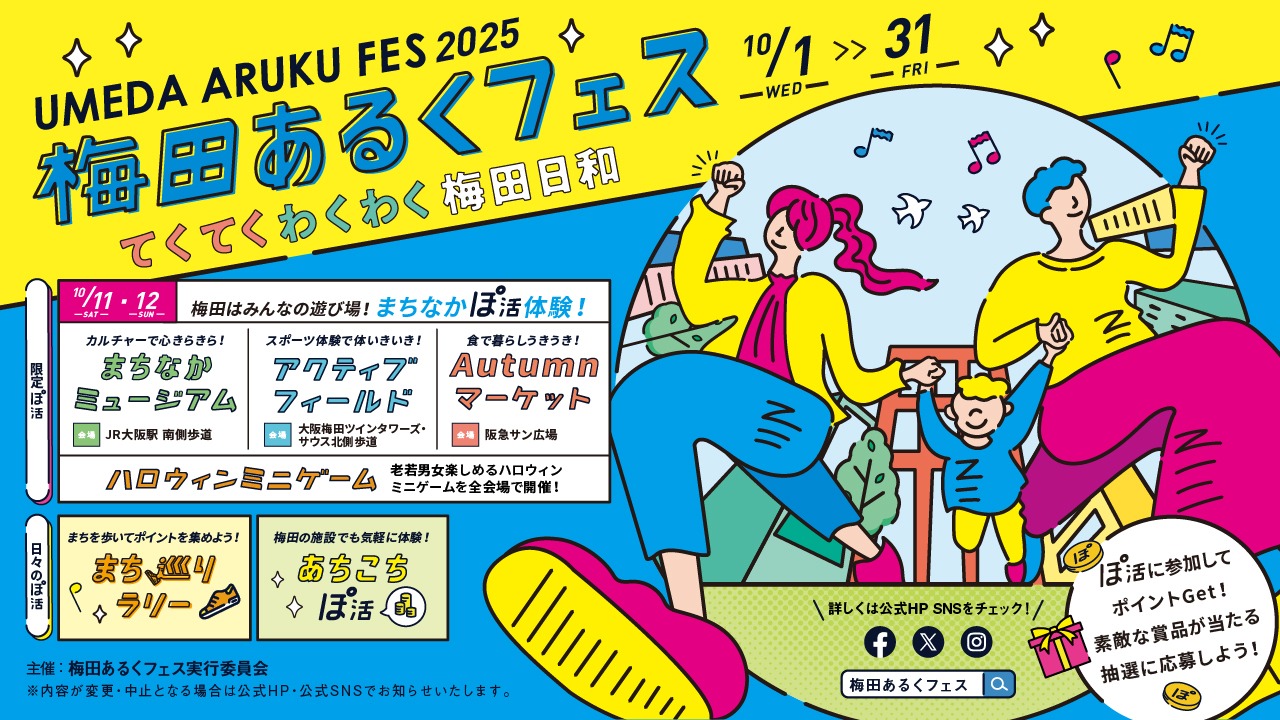通知 一覽 2025/9/26 召開「梅田走的Fes2025」! 梅田走的Fes實行委員會,召開10月1日(星期三)~31日在(星期五)上(裡)關於把「漫遊×健康」作為主題區域活動「梅田走的Fes2025」。 詳細,請確認添加資料。